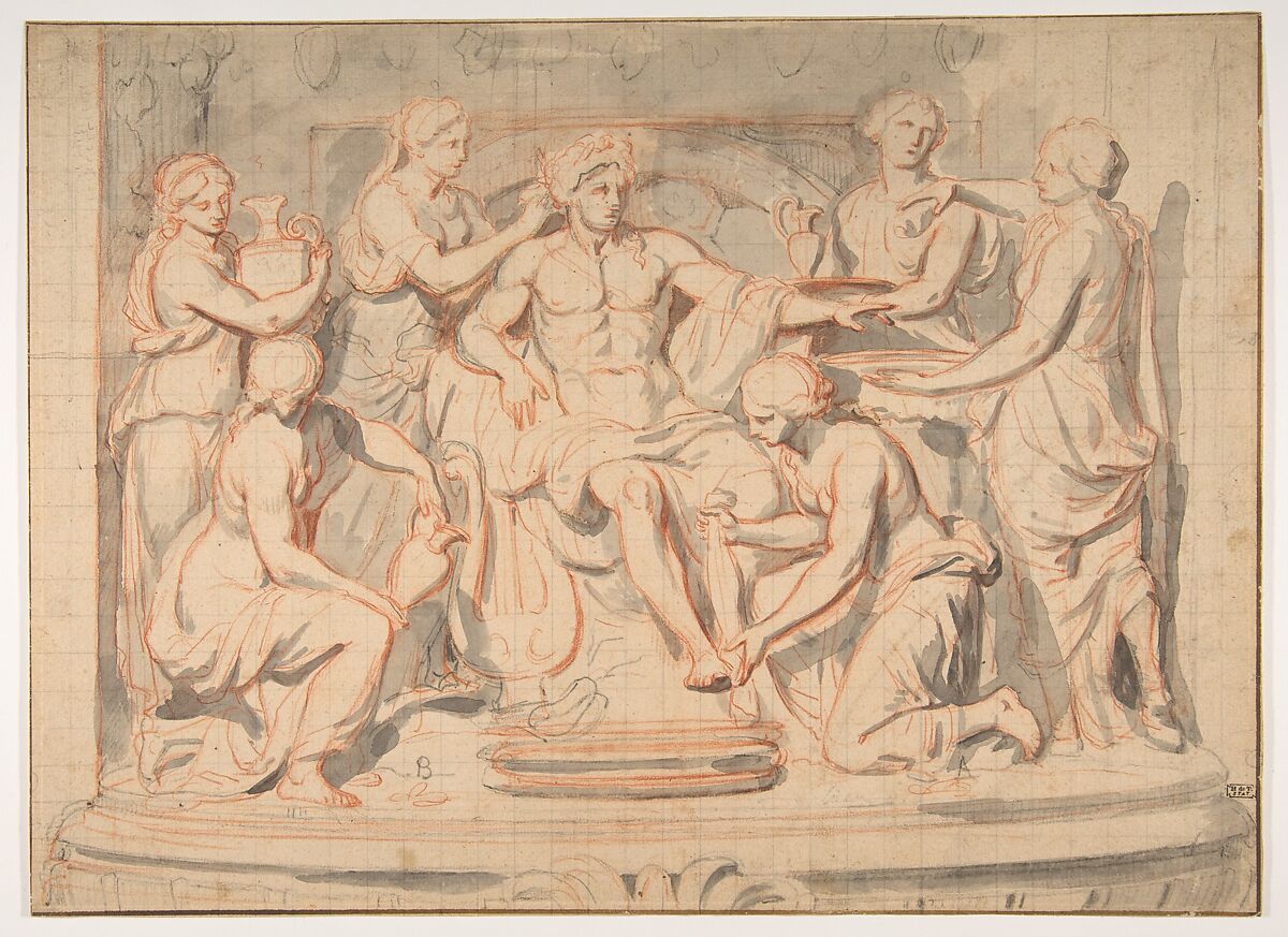 - Medium: Brush and gray wash, over red and black chalk; squared in black chalk; framing lines in pen and brown ink