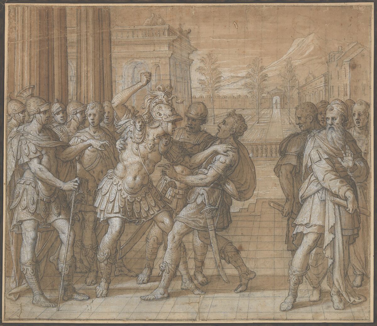 - Medium: Pen and brown ink, brush and brown wash, heightened with white, over black chalk underdrawing