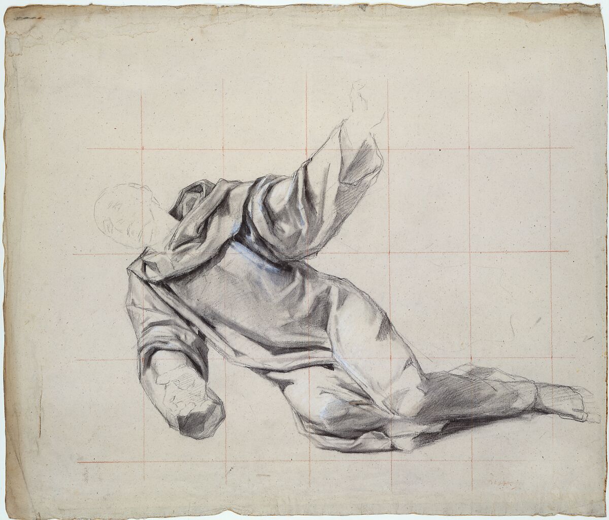 - Medium: Black chalk, stumped, heightened with white chalk on beige paper; squared in red chalk