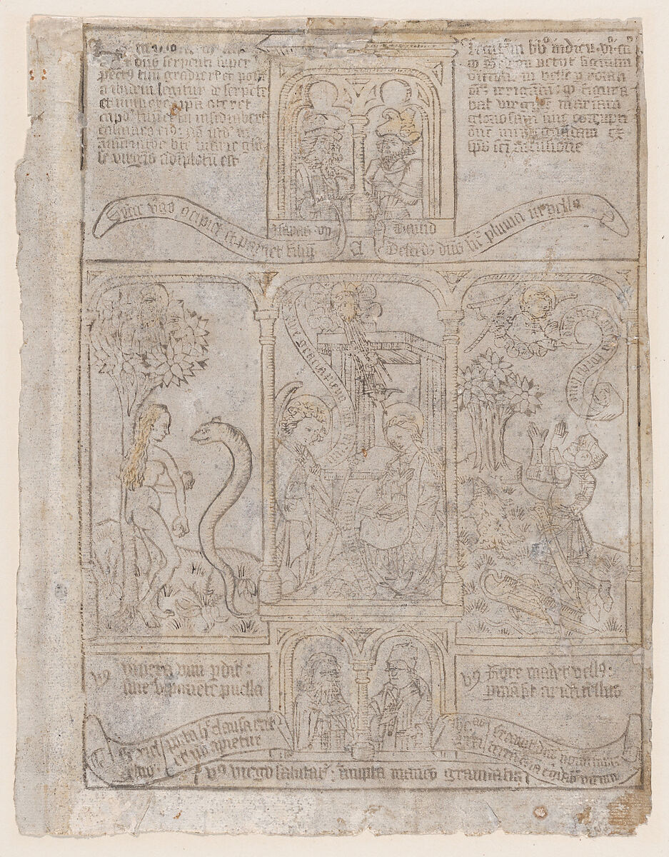 - Title: The Annunciation, flanked by Eve and the Serpent and Gideon's Fleece, from a "Biblia Pauperum" blockbook, third edition