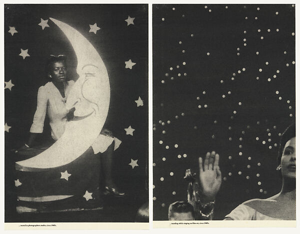 In Backdrops, Circa 1940, Simpson combines the image of an anonymous woman balancing on a crescent moon with a cropped picture of singer and activist Lena Horne from the set of the 1943 movie I Dood It. Because of racist regulations, Horne’s musical scenes were cut from the version of the film sent to Southern venues, an affront Simpson alludes to by positioning the photograph at the edge of the sheet. However, by showing Horne’s image enlarged and paired with that of the anonymous woman, Simpson imagines an alternative history where Horne is singing and celebrated. Text below the images indicates that they both date to the 1940s, allowing the artist to contrast their sense of nostalgia and glamor with the brutal history of the decade.
