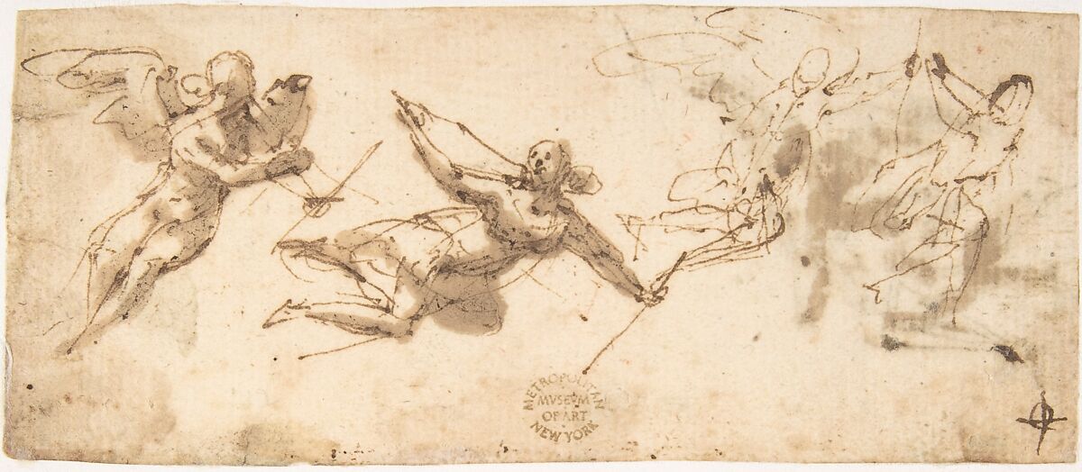 - Medium: Pen and brown ink, brush and brown wash (recto); two flying figures in pen and brown ink (verso)