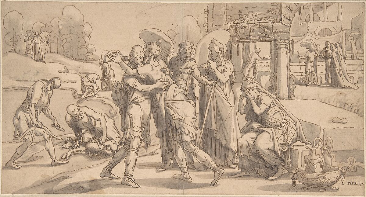 The drawing is signed ‘L. Pier’ in the lower right corner – an abbreviation of Pieter Aertsen’s nickname ‘Lange Pier’, meaning Long Peter. The sixteenth-century Netherlandish artist is mostly known for his highly realistic paintings of still-lives and genre scenes. In contrast, his works with religious subject matter tend to show a more mannered style. The drawing depicted here is illustrative of Aertsen’s mannerism, apparent in the noticeably elongated features of the figures, their ovoid shaped heads, as well as the stylistic properties of the vessels seen in the lower right.