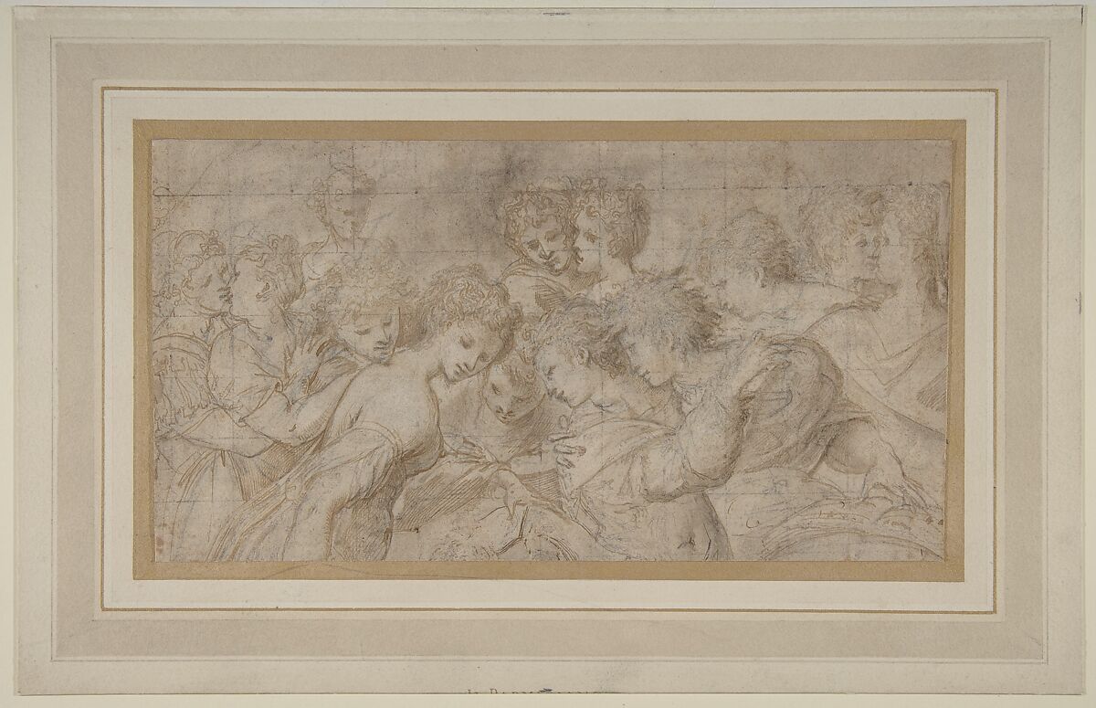 - Medium: Pen and brown ink, brush and brown wash, partly highlighted with white gouache (somewhat oxidized), over black chalk; squared in black chalk