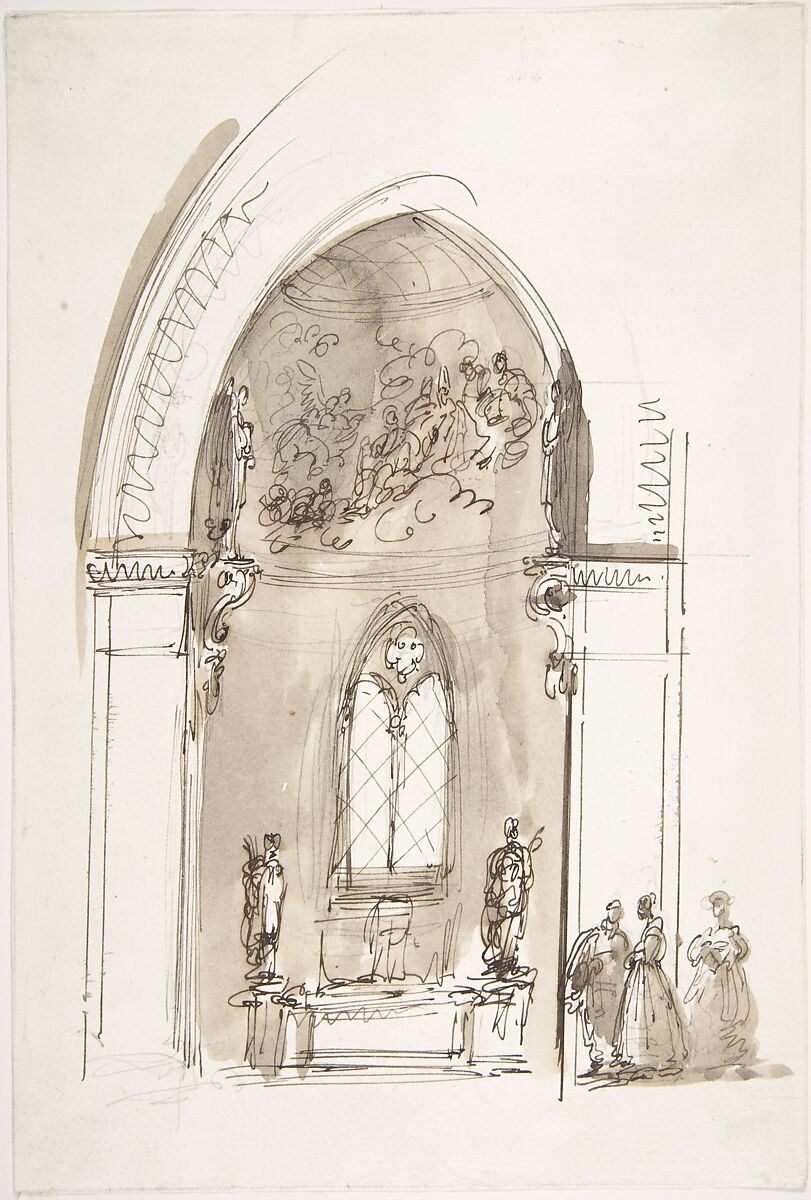 - Title: Chapel in a Gothic Church (recto); Outline sketch of an oval form (verso)