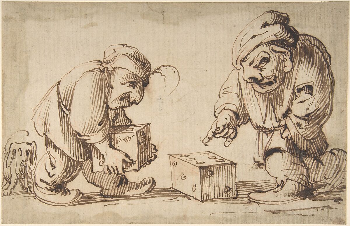 - Title: Two Dwarfs Playing Dice, a Dog at Left (recto); Study of a Leg (verso)