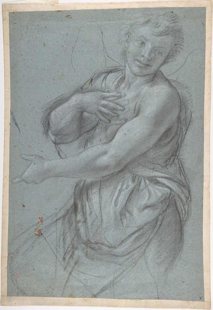 A young model, probably a studio assistant, posed for Annibale Carracci in this study of an angel-- the wings are only lightly indicated above his shoulders, almost as an afterthought. The angel's figure appears on the right in Annibale's altarpiece Saint Gregory Praying for the Souls in Purgatory, commissioned by Cardinal Antonio Maria Salviati about 1600-1602. The altarpiece, painted for a chapel in the church of San Gregorio Magno, Rome, was destroyed during World War II when it was in the collection at Bridgewater House, London. There are only minor changes in the configuration of the angel's draperies in the final painting. Figural studies done with chalk by the artist dating after 1600 are rare: two composition studies for the same altarpiece are preserved at Chatsworth and at Windsor Castle. while a third drawing with studies of the standing angel's head and left arm is in the Musée des Beaux-Arts at Dijon (se here "references" and McTavish 1975).