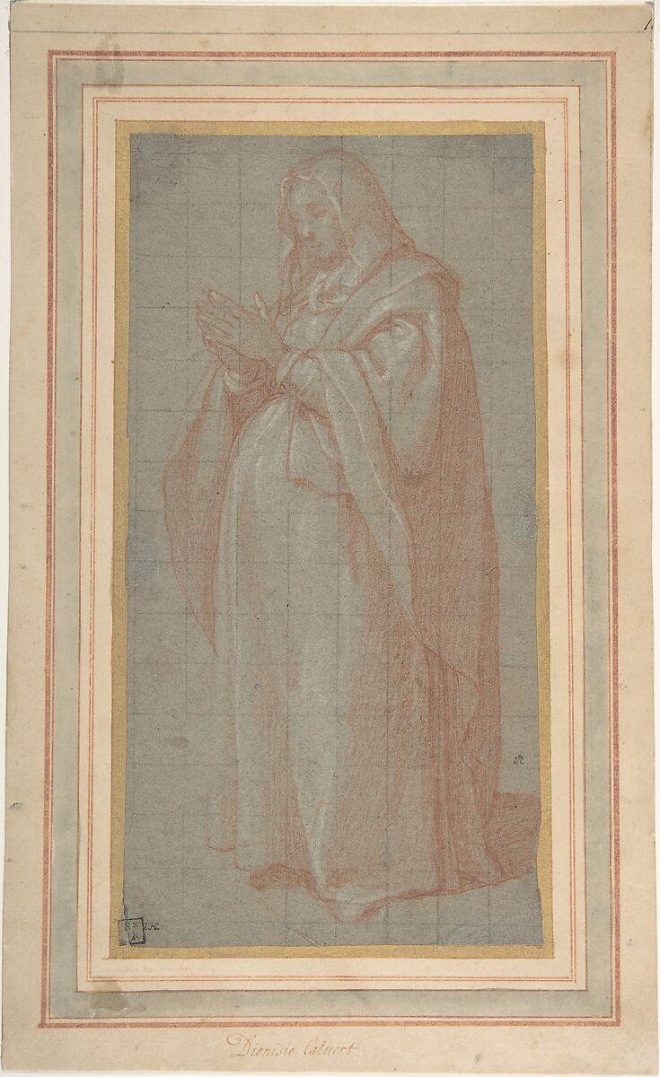 Traditionally attributed to Denys Calvaert – as recorded on the mount by an elegant inscription of Jonathan Richardson Sr. (1667–1745) – this drawing is a typical example of the chalk draughtsmanship of Bartolomeo Cesi, a leading artist of the Bolognese scene during the age of the Counter Reformation in the late sixteenth century. Drawn in red and white chalks on blue paper, this sheet is in fact a study for the ‘Pregnant Virgin Mary ’, originally frescoed by Cesi in the Manzoli (or Manzuoli) altar of the Church of Santa Maria delle Febbri known as Madonna di Miramonte (Bologna) and now preserved as a detached fresco in the Chiostro delle Madonne of the Certosa di Bologna. The correspondence with the fresco is very close, though in the fresco the Virgin holds an open book in her joined hands.In the church of Miramonte, the fresco was first noticed by Carlo Cesare Malvasia in his account ‘Felsina Pittirice’ (as "a fresco la B.[eata] V.[ergine] gravida nell’Altare Manzoli nella Madonna di Miramonte, una copia della quale in picciol rame trivansi presso il sig. Floriano Malzezzi Concanonico nostro, e tante presso tant’altari, essendo stata così comunemente piacciuta" 1686 [ed. 1841], p. 246). In these words, Malvasia highlighted the incredible visual fortune of Cesi’s ‘Pregnant Virgin’, which was copied in numerous versions and various media, just shortly after its execution.