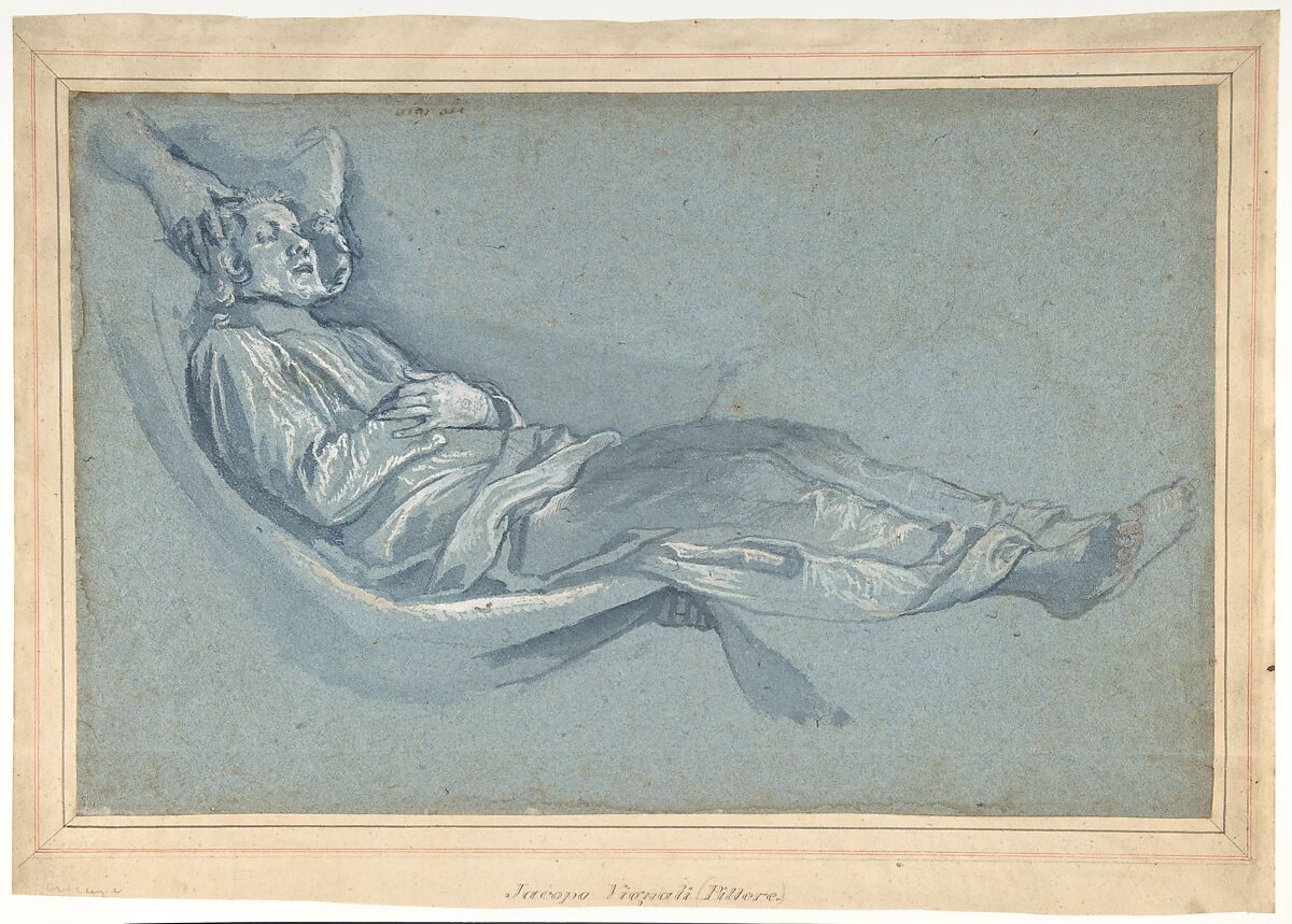 On the recto, a studio assistant reclining in a hammock (?) is studied for the figure of Saint Paul being lowered into his tomb. The two hands at upper left indicate the action of reuniting Saint Paul's head with his body at the moment of burial (the Apostle was beheaded), while the hand indicated below the figure's knees is intended for one of the bearers of the corpse. The kneeling figure on the verso is a Roman matron who assists devoutly at the interment.In style and in technique (blue wash on blue paper) the drawing is characteristic of the draughtsmanship of the mature Cigoli, and the mistaken old attribution to Jacopo Vignali (annotated on the mount) can perhaps be explained by the preponderant influence of Cigoli on the work of this Florentine artist of the following generation.