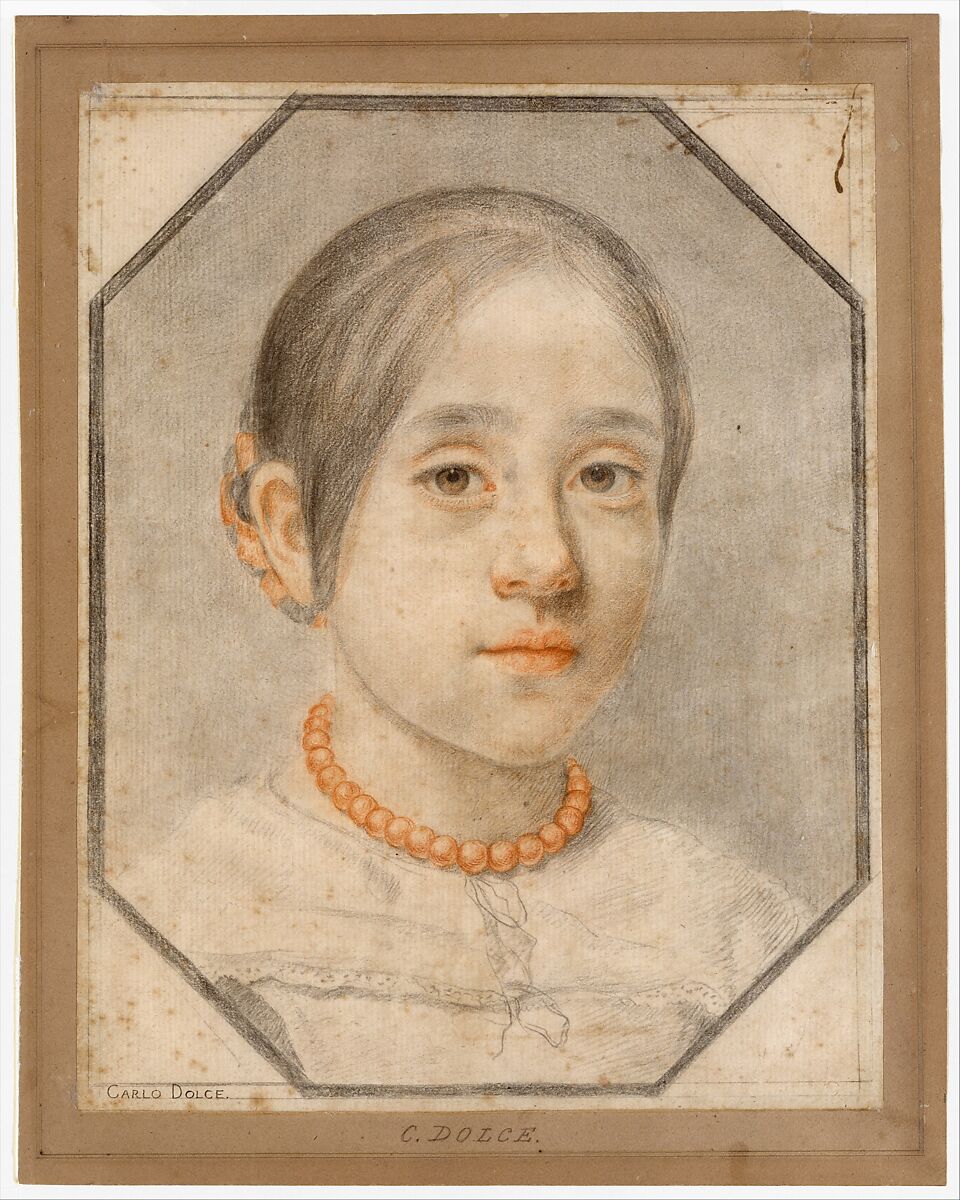 Early Baroque draftsmen refined red-and-black chalk drawing to achieve exquisite, naturalistic, and chromatic effects in portraits and figure studies: the Florentine painter and draftsman Carlo Dolci was an extraordinary practitioner of this technique. The combined use of red and black chalk was perfected by Florentine seventeenth-century artists and frequently employed in Italy and France in the next century by artists such as François Boucher (1703-1770), who may well have owned this drawing. Dolci described an octagon around the portrait, suggesting that the drawing may have been preparatory for a painting in that shape.The drawing in the Metropolitan Museum of Art appears to date from the last years of the artist's life, when he was housebound and barely painting after repeated bouts of melancholia. Agata was the youngest of Dolci's seven daughters, and may have been an artist like her better-known elder sister, Agnese Dolci (d. in 1689).