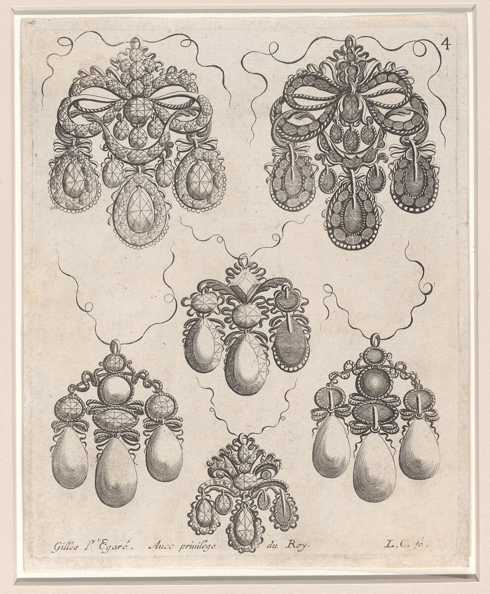 Just like today, historic jewelry design was influenced by trends. Faceted gemstones were popular in the sixteenth century, while early seventeenth-century jewelry was decorated chiefly in enamel. During the later decades of the seventeenth century, fashion called for diamonds. Opulent chandelier-style earrings and pendants with multiple dangling stones such as those depicted here became extremely popular. This print is part of jeweler Gilles Légaré’s Livre des ouvrages d’orfèvrerie, which showcases ingenious designs in which large diamonds and pearls appear to be held up by ribbons. Each jewel is depicted from both front and back to help fellow goldsmiths understand how the heavy stones could be attached in a secure and elegant manner.