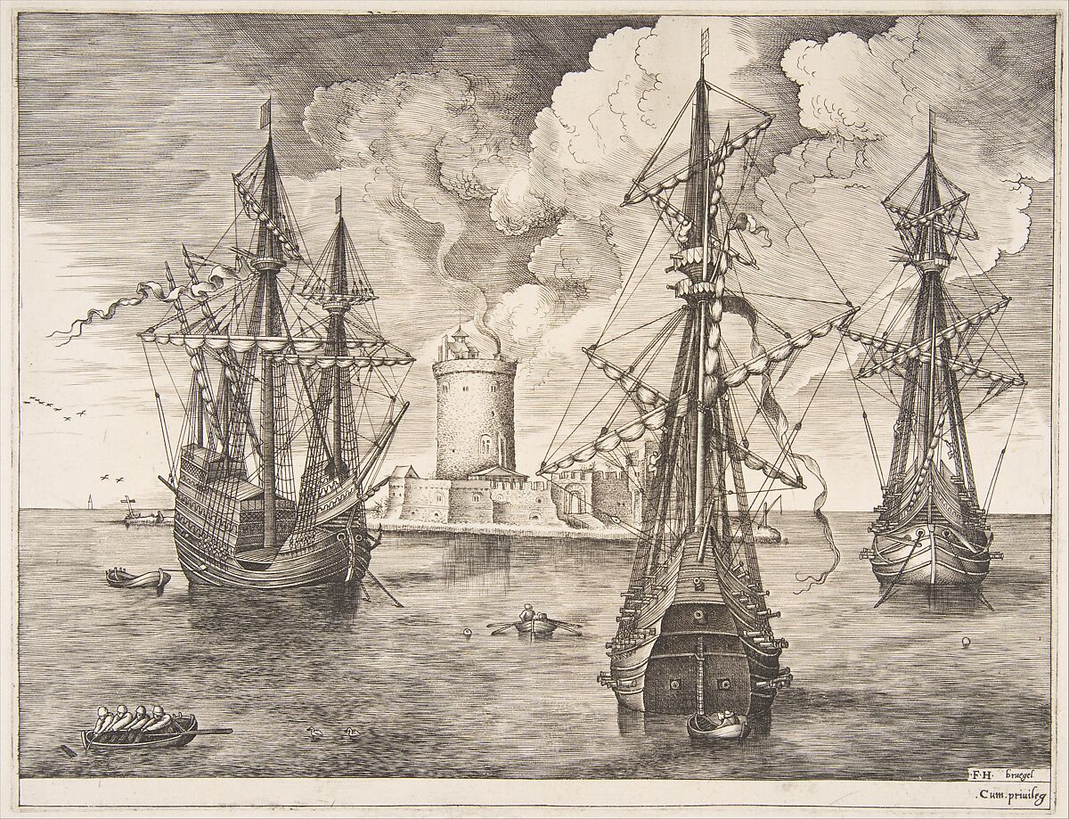 This engraving belongs to a series of ten prints known as the Sailing Vessels, executed by Frans Huys after designs by Pieter Bruegel the Elder. The series displays a wide range of sailing vessels, including merchantmen and warships, large seagoing vessels and small coasters, galleys, and caravels. Here, Bruegel depicted a four-master, i.e., a ship with four masts, and two three-masters anchored near a fortified island capped by a lighthouse. The detail and painstaking accuracy with which the vessels are rendered attests to the artist's great care and leaves no doubt that Bruegel must have prepared for the series by making numerous sketches and elaborate studies—all of which unfortunately are lost. At what point in his life Bruegel became interested in the subject of ships is unclear, but the deep fascination the citizens of Antwerp took in it is understandable given the nature of the city's economy. As a mercantile superpower with direct access to the North Sea, and as home to some of the most ambitious traders and explorers in Europe, Antwerp took great pride in the prowess and engineering of their ships and in their connection to the sea. Whatever the precise source of their appeal, Bruegel's series of Sailing Vessels was a highly sophisticated creation that far surpassed previous examples of the genre in technique and imagination.