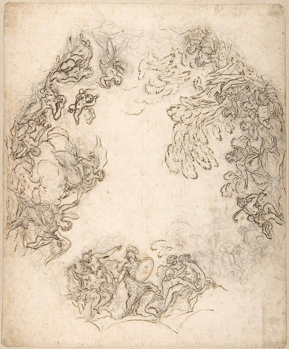 - Title: Design for a Ceiling Decoration: A Gathering of Mythological Figures (recto); Dancing Satyr and Two Seated Figures (verso)