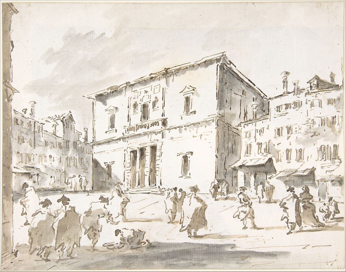 This view of the Teatro La Fenice (Fenice Theater) is one of Francesco Guardi's last drawings. The Fenice, the work of the architect Giovanni Antonio Silva, was begun in 1790 and opened in April 1792, less than a year before Francesco Guardi's death. The drawing is well preserved, although James Byam Shaw has suggested that the accents of gray wash, used to strengthen the shadows in the foreground and on the theater and adjacent buildings, may have been added by Giacomo Guardi. In any case the son is entirely responsible for the drawing of architecture on the reverse of the sheet.