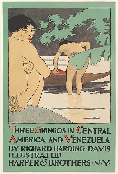 Evoking Paul Gauguin’s representations of nude Tahitians, which reflect a sexual and racial fantasy forged from a position of patriarchal and colonialist power, Penfield’s poster advertises a group of short stories by war correspondent and adventure novelist, Richard Davis. The book’s title, Three Gringos, marks the protagonists (who represent Davis) as foreigners in the Spanish-speaking countries of Central and South America, where the writer often visited. This collection not only describes the author’s wanderlust but also weaves his personal objections to the use of U.S. forces to protect Venezuela and Central America into the stories.