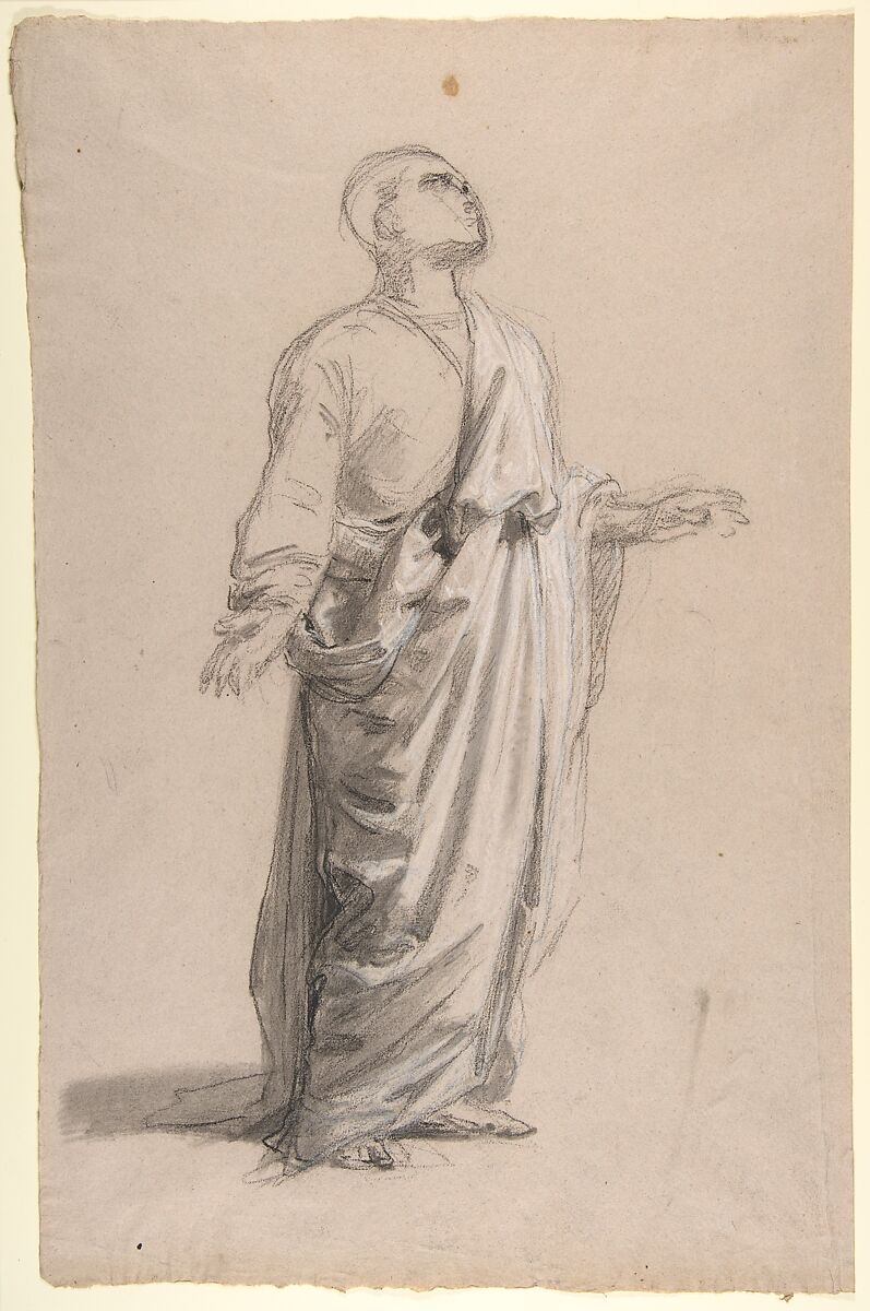 - Medium: Black chalk, stumped, white chalk, on light gray paper