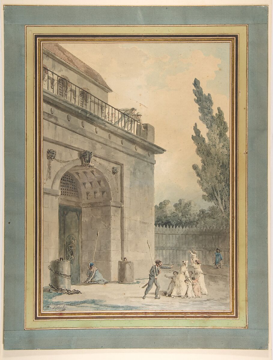 During the second half of the eighteenth century in France, Hubert Robert was a fashionable artist. Painter of ruins, professor of landscape drawing, curator for the future Louvre museum from 1777, and draftsman of the gardens of the king from 1778, he counted among his clientele the royal family, the most eminent members of the court in Versailles, voluntarily exiled aristocrats like the Noailles family, and powerful financiers like the marquis de Laborde. As a result, and like many of his colleagues, Robert endured the consequences of the French Revolution which began in 1789. He was suspected "for his recognized incivism and his links with the aristocrats" by the members of the Convention on October 3, 1793 and was imprisoned in the Sainte-Pélagie prison from October 29, 1793 to January 31, 1794, before being transferred to the Saint-Lazare prison, where he remained until his release on August 4, 1794. If Robert escaped the guillotine, he remained very affected by his imprisonment. In jail, he continued to draw and paint, especially on ceramic dinner plates that he sold at low cost. In watercolors made after his release, themes of imprisonment and liberty continued to play a prominent role.