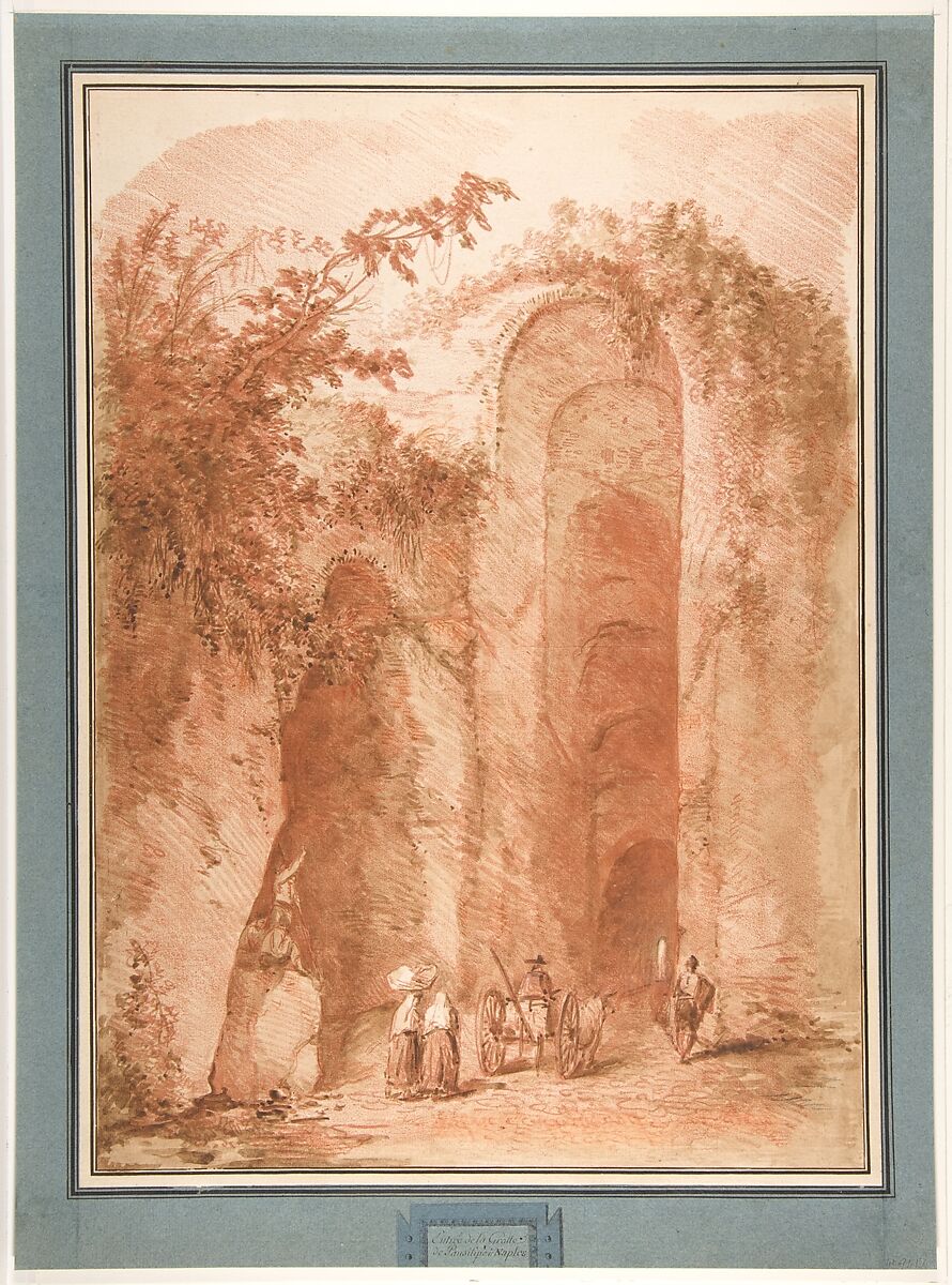 Located on the route from Naples to Pozzuoli, the Grotto of Posillipo was a popular destination for travelers to Italy in the eighteenth century. Hubert Robert visited the site in 1760, on a trip he took with the abbé de Saint-Non (1727-1791). The studies he made there are today documented only by a watercolor held in a private collection (London, Christie’s, December 12, 1985, lot 324) and an etching by Clément-Pierre Marillier and Emmanuel J. N. de Ghendt for Saint-Non’s Voyage pittoresque ou description des royaumes de Naples et de Sicile (1781, tome I, p. 82, no 37).