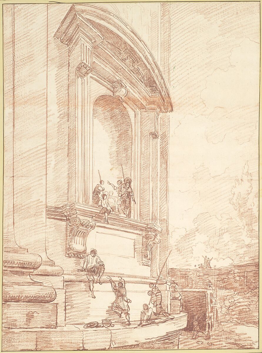 This undated drawing relates to a group of views of the Vatican Robert executed in 1763. To emphasize the curvature of Michelangelo's niche, Robert chose a low, oblique vantage point. The perspective presented difficulties nonetheless, despite his use of a straight edge in places. On the left, the hatching sets the columns in shadow, but does not produce a convincing sense of volume. Nor is the rendering of the right side of the pediment, where it is supported by columns and brackets, convincing, largely due to the fact that the perspective of the cornice and that of the entablature do not align. Despite the clumsiness of occasional passages, the architecture plays host to groupings of quickly sketched peasants, some of whom have clambered up into the empty niche, occupying a space presumably intended for sculptures. In the background, a couple of tiny figures are seen in silhouette atop a high wall.