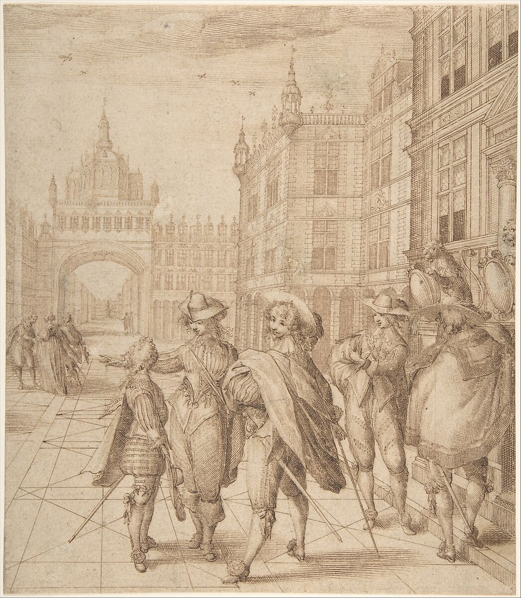 Elegantly dressed aristocratic figures converse in small groups in a city square. Saint-Igny’s skill is on display, both in his detailed treatment of the figures’ flamboyant attire and coiffures, and in his precise rendering of the architectural setting. Not only a painter and draftsman, Saint-Igny was also a printmaker—technical background that is evident here in his tightly controlled and highly varied use of line.