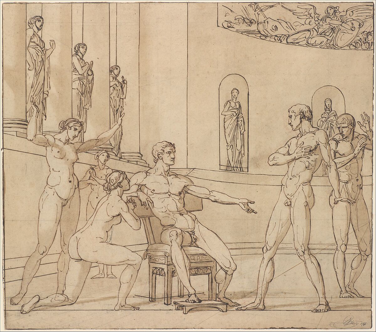 Vincent’s pen-and-ink lines vibrate with an elegant muscularity in this compositional study for his 1787 painting The Clemency of Augustus. Like his contemporary Jacques Louis David, Vincent worked out the compositions of his history paintings by first drawing the figures nude. The declamatory poses of the figures reflect their dramatic pedigree, as the artist here depicts the concluding scene of Pierre Corneille’s 1641 play, Cinna.