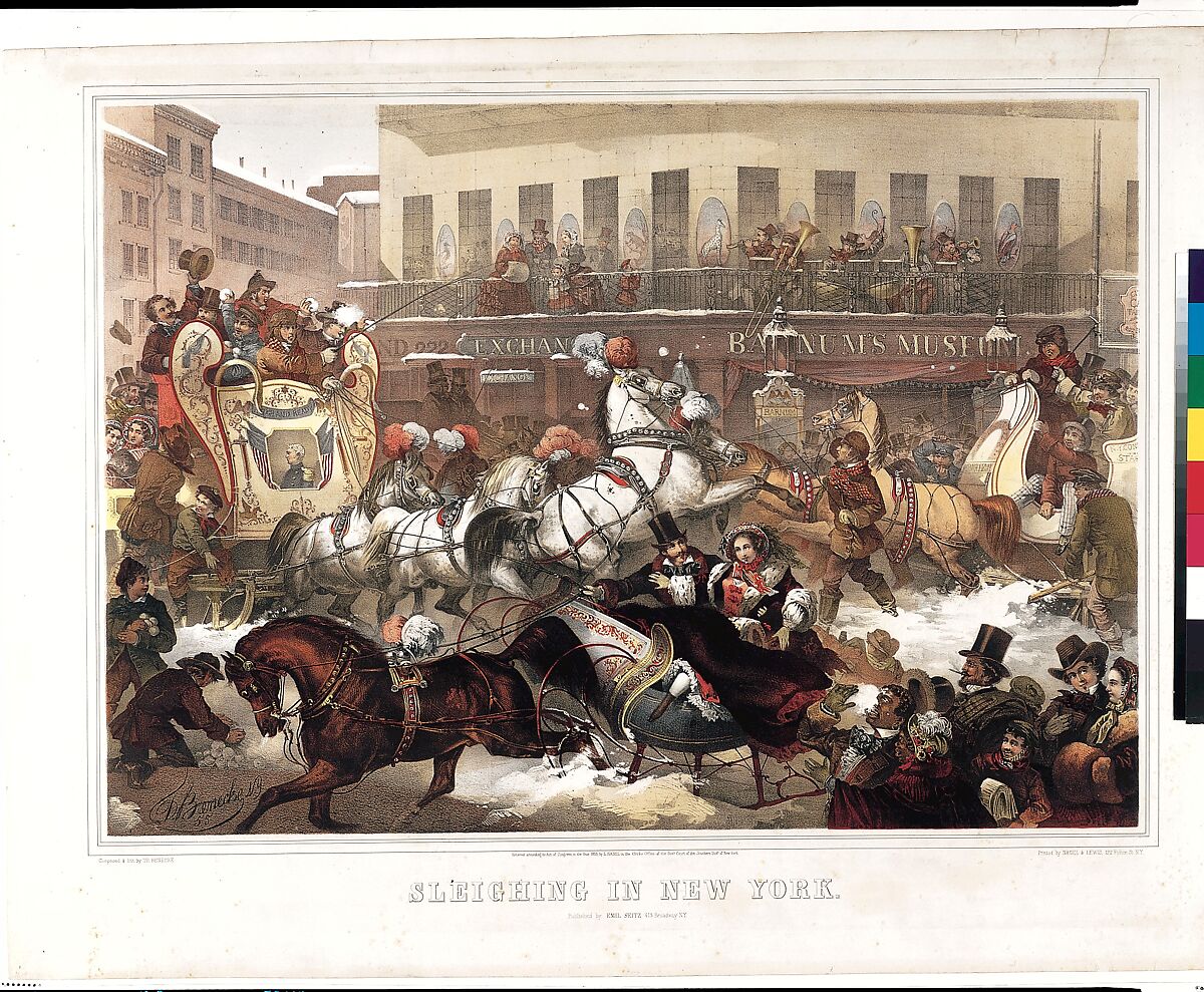 New York view, looking east across Broadway and showing Barnum's Museum with congested sleigh traffic filling the street.