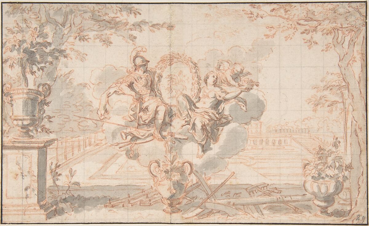 - Medium: Brush and gray wash, over red chalk; squared in graphite; framing lines in pen and brown ink. Vertical crease just left of center.