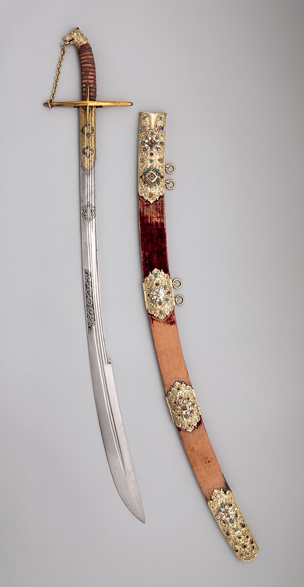 This is one of a series of twelve jeweled sabers made in Hungarian style for use at the Saxon court in Dresden. These twelve swords are recorded as having had new wrist chains added in 1687 and as having been used again in 1709. This example bears what may be the mark of Georg Hoffmann (recorded 1586–1609), a goldsmith working in Breslau (now Wrocław, Poland).