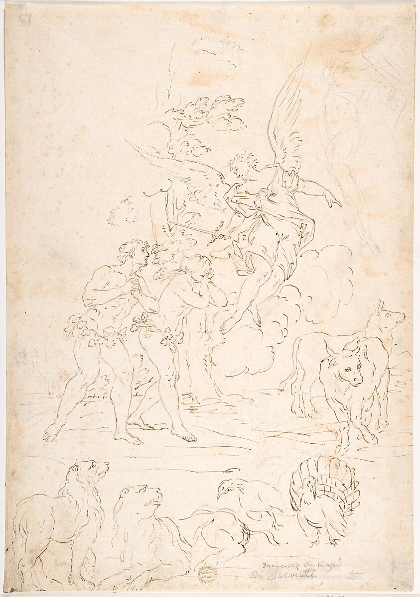 - Medium: Pen and brown ink over black chalk on light tan paper (recto); inept sketches in red chalk and in pen and brown ink (verso)