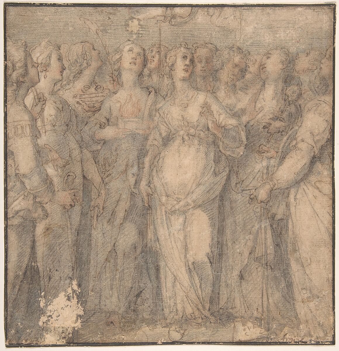 This drawing entered the Met's collection with an incorrect attribution to Sodoma, which had been scribbled on the backing of the original sheet. A new attribution has been proposed to Filippo di Benedetto Paladini (ca. 1544-ca. 1614), one of the last Tuscan Mannerist painters, who worked in Malta between 1590 and 1595 (Vita Segreto, written communication, 9/2/2012). Dr. Segreto, who is publishing this rather finished drawing in her monograph on the artist, has also suggested that it represents the rare subject of the Holy Virgins, which had special meaning in religious art commissioned by patrons connected with the Jesuit order. The style and technique of the drawing certainly agree with those of Florentine late Mannerist draftsmen.
