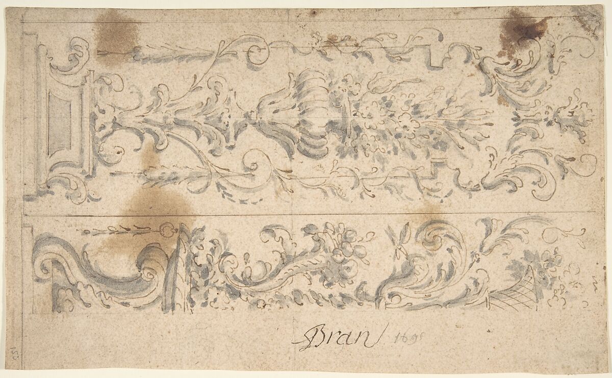 - Medium: Pen and brown ink, brush and gray wash, over traces of leadpoint or graphite, with ruled construction; framing outlines in pen and brown ink