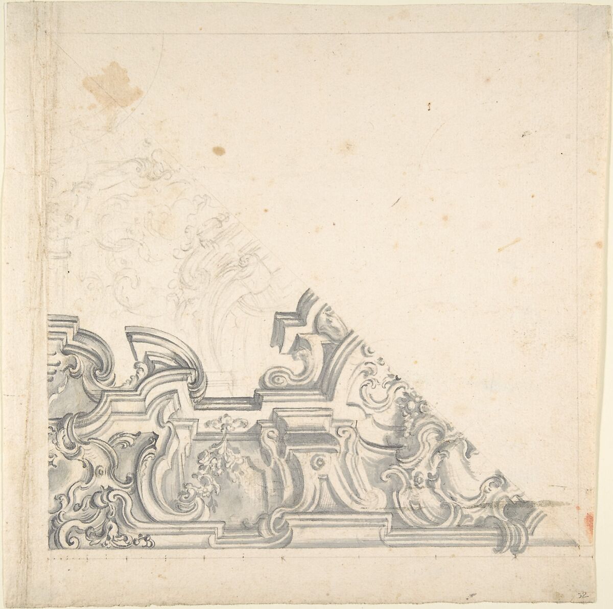 - Medium: Pen and gray ink, brush and gray wash, over leadpoint, with ruled and compass construction; framing lines in leadpoint