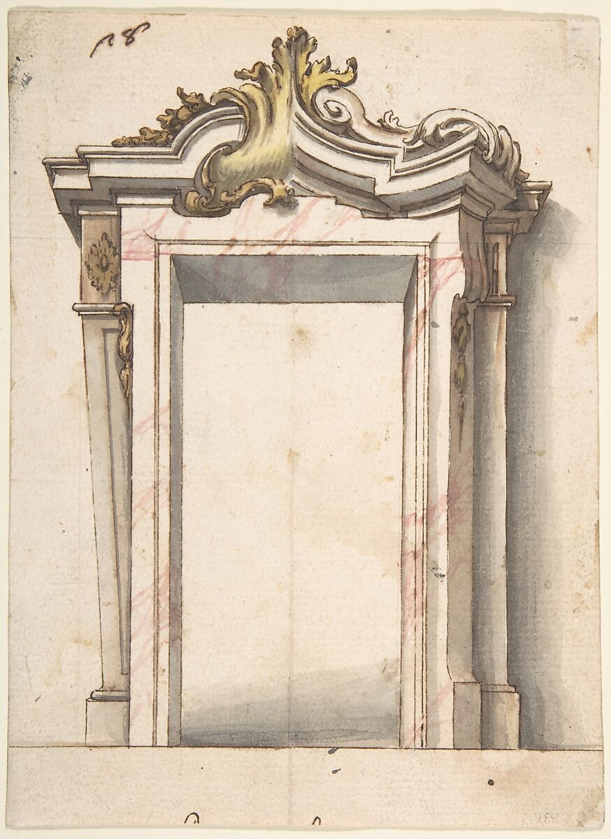 The artist who drew this design has made clever use of his sheet of paper by combining two different variations for the design of a marble doorway in one drawing. Since Baroque art was characterized by its symmetry, only one half of the design sufficed to create an understanding of the whole. The drawing was bought as part of a large group of Piedmontese designs for interior architecture, which illustrate the transitions in style from Baroque to Rococo and finally Neoclassicism. This design in particular is interesting because it incorporates the transition from the late Baroque to the Rococo style. The overall, somewhat austere character of the architecture is still typical for the Baroque, but the ornaments on top of the door frame herald the new interest in the whimsical rocaille ornaments which resemble shell shapes or the crest of a wave.
