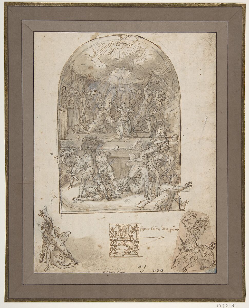 - Medium: Pen and brown ink, brush and brown wash, some white highlighting, over black chalk