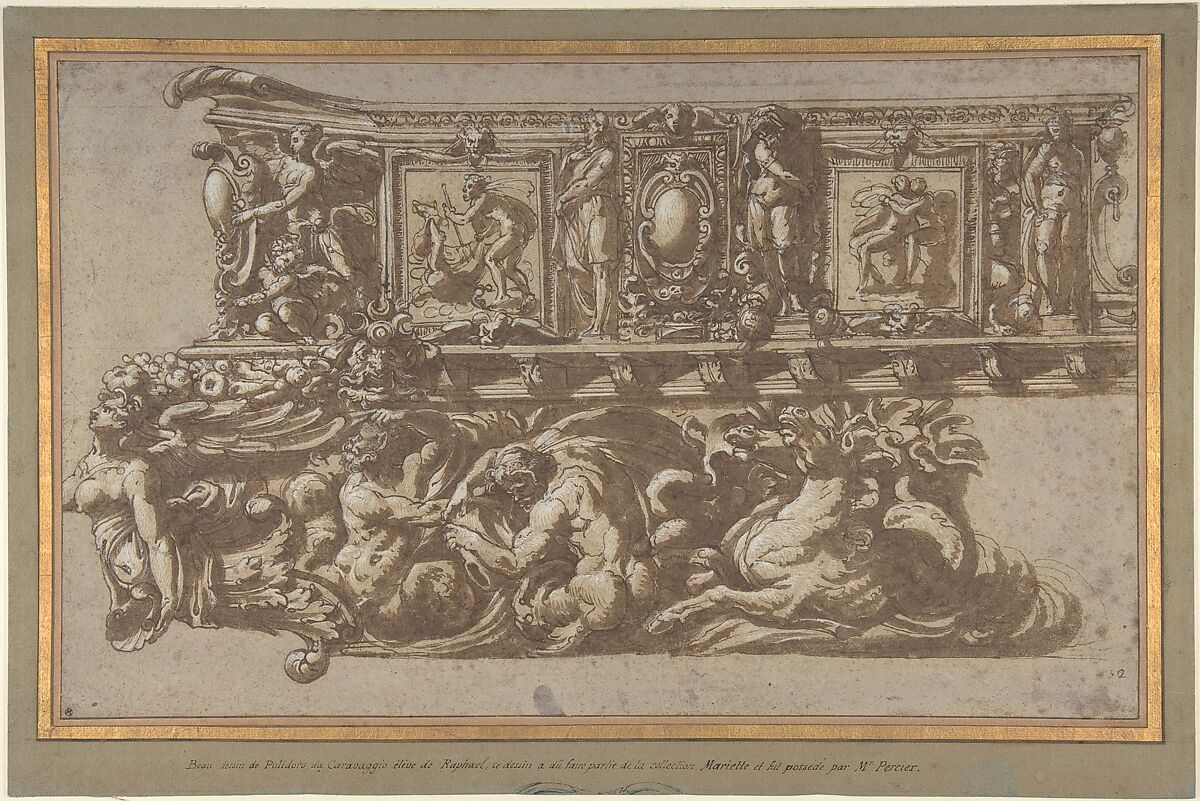 Another study with some variations for this elaborate decorative construction, which may well have been intended for a festival float, is in the Musée des Beaux-Arts, Rennes (inv. C 65.1). Both drawings in New York and Rennes bear a traditional attribution to Polidoro da Caravaggio, but Bernice Davidson pointed out that they are the work of some close follower of Perino del Vaga. According to Florian Härb and Marzia Faietti (see here Bibliography), the Metropolitan Museum of Art drawing could be an early work by the Bolognese painter and prolific drafstman Prospero Fontana (1512-1597) who, after a short period spent with Innocenzo da Imola, joined the Roman workshop of Perino del Vega at just sixteen years of age.