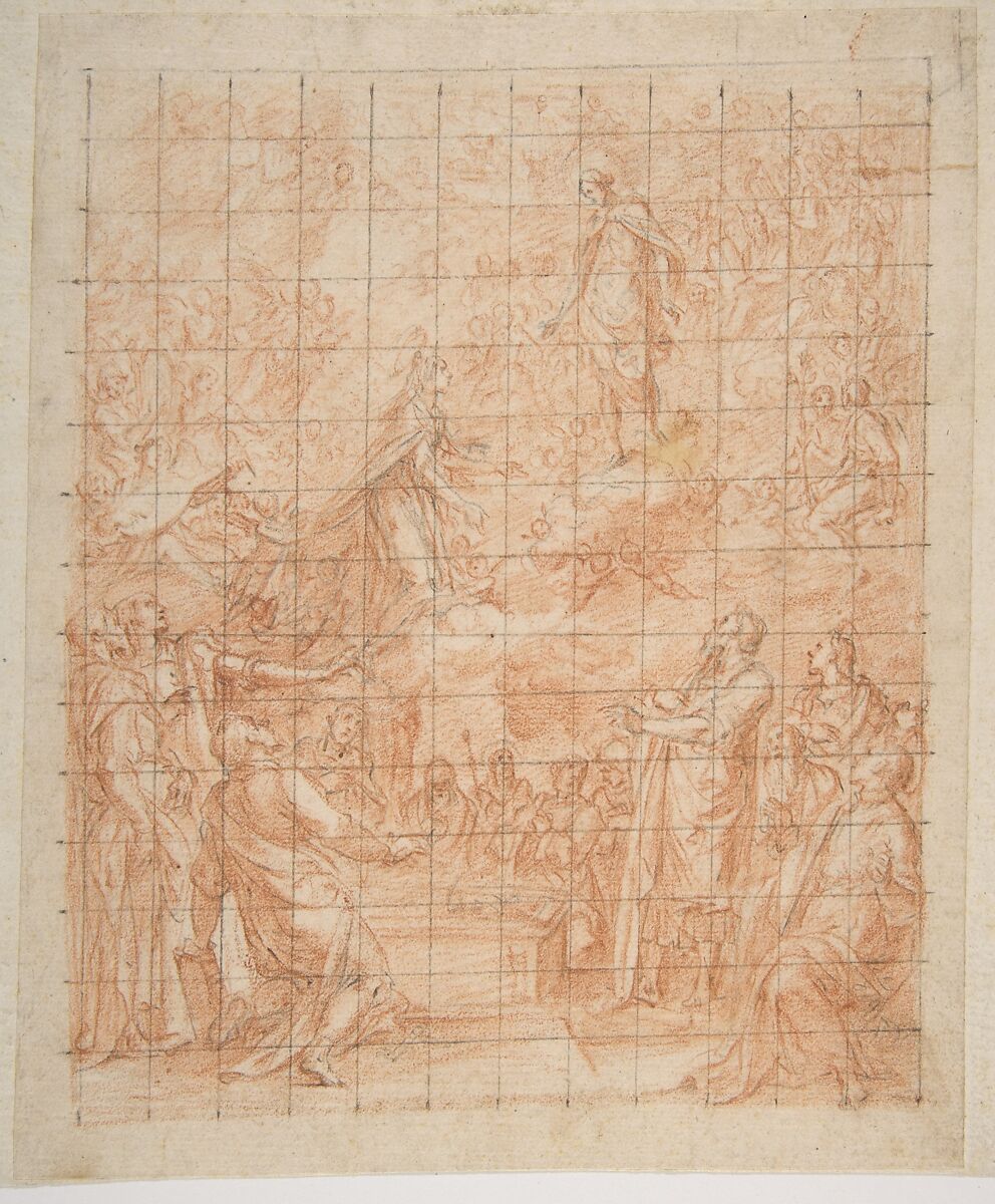 - Medium: Red chalk, over charcoal, squared for transfer
