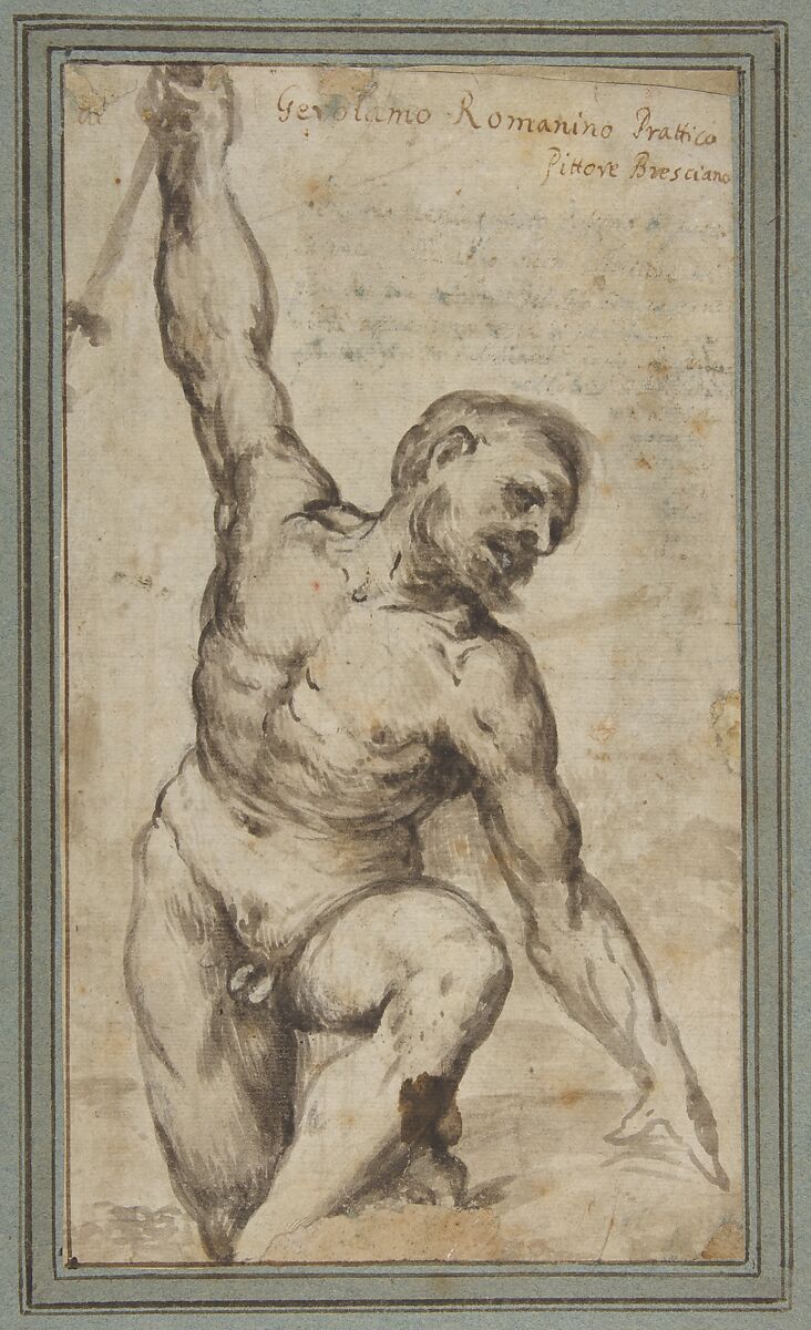 The historical attribution of this drawing to Romanino is due to the Milanese Eighteenth-century collector and connoisseur Sebastiano Resta, who annotated the sheet on top "Gerolamo Romanino Prattico / Pittore Bresciano" (Resta's autography was recognized by Carmen Bambach and endorsed by Alessandro Nova in 2005, see here Bibliography). Jacob Bean accepted Florence Kossoff's proposal that this might have been a preparatory study for the figure of Adam in the scene of Christ's Descent into Limbo, painted by Romanino between 1534-35 in a fresco cycle for the church of Santa Maria della Neve, Pisogne. The drawing, like the Pisogne fresco, probably dates from the last decade of Romanino's life (the previously published date of ca. 1574 seems incorrect in view of the artist's probable death date). In Carmen Bambach's opinion, the resemblance between the drawing and Pisogne fresco seems generic rather than direct; the poses and physical types of the male figures seem quite different.