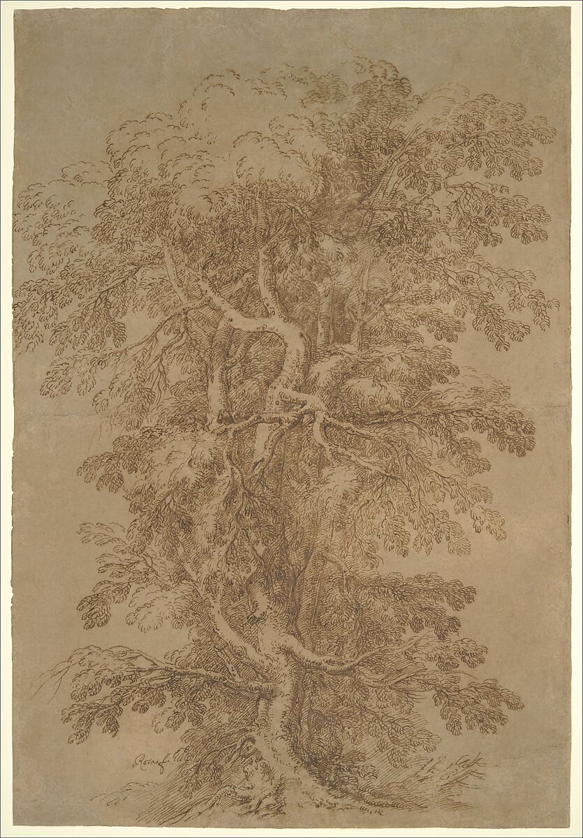 Of his myriad achievements as an artist and man of letters, the brilliant and moody Salvator Rosa's contributions to the increasingly popular genre of landscape in the seventeenth century loom large. This spirited drawing of a towering, gnarled tree, its dense matrix of branches and leaves rendered in careful detail, is exceptional not only for its monumental scale but also for its exclusive focus on a single specimen: divorced from any narrative context, the tree is also isolated from a broader landscape-the arboreal equivalent of a solitary, standing figure.