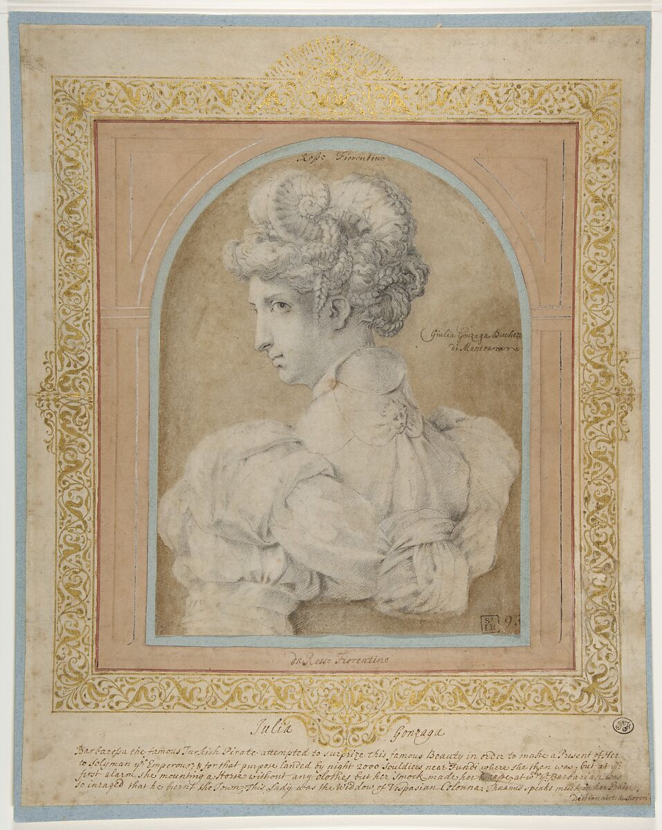 Rosso intended this drawing as an ideal representation of a beautiful young woman, in response to the genre of "teste divine" (divine heads) that Michelangelo made famous in drawings of the 1520s and 1530s, especially the "Zenobia" (Uffizi, Florence). Here, he invented elegant "s" shaped rhythms for the figural pose. The woman is seen in bust-length from the back, her head turned in profile, slightly lowered, to gaze directly at the viewer, while the exquisite complexity of details of her fashionable dress soften her pose with airy curves and twists. Her fantastic coiffure is laden with braids curled around a pair of ram's horns, while her artfully puffed-up dress, with layers of agitated drapery, is fastened on the back with a mask-like brooch. Although minor passages were touched up with ink and the figure was silhouetted with wash at a later time, the characteristic clarity and precision of Rosso's original drawing in chalk are plainly evident. The delicately ornate mount and the pen inscription below, telling the colorful, apocryphal story about the presumed subject of the drawing, are both due to the British collector John Talmann, who incorrectly thought this to be a portrait of Giulia Gonzaga (1513-1566), Contess of Fondi, a famous beauty in her day.