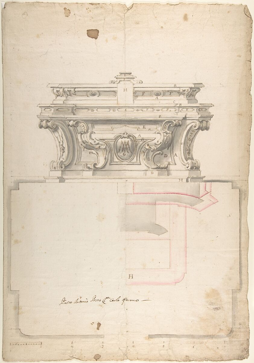 - Medium:Pen and brown ink, brush with gray and pink (only at plan drawing) wash, over graphite (recto); scales at bottom in pen and brown ink over graphite