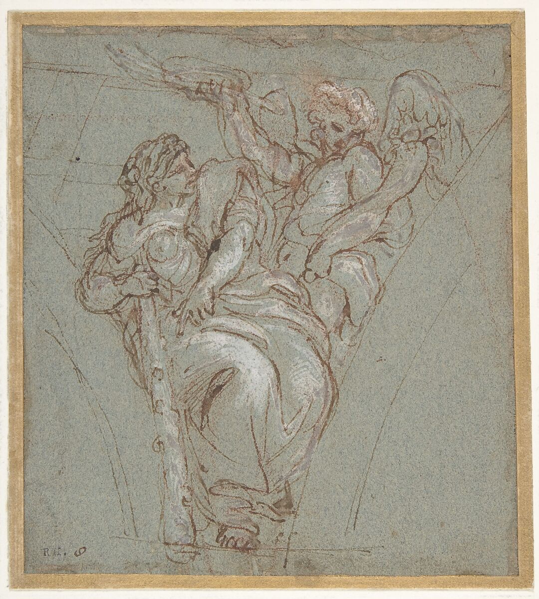 Together with three other sheets in the Metropolitan Museum (inv. nos. 64.295.1, 66.137 and 66.53.3) the present study relates to the Altieri decoration and constitutes a preliminary sketch by Maratti for an Allegorical Virtue crowned by Honor. Maratti executed the figure on blue paper with a quick sketch in pen and ink, highlighted with white gouache, and developed this dynamic group on a second, highly-finished drawing in red chalk, also in the Museum’s collection (inv. 64.295.1).
