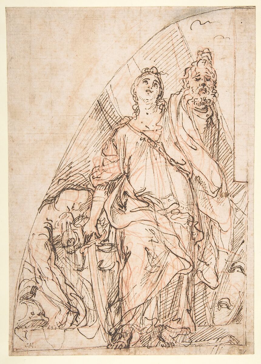 Like the study for Jael Slaying Sisera - Metropolitan Museum of Art inv. 36.101.2 - , this sheet relates to the mosaics of biblical subjects that Maratti designed for Saint Peter's Basilica in the later 1670s. The subject is another Old Testament heroine, Judith, who vanquished the Assyrian general Holofernes, an enemy of the Jews, by seducing him and cutting off his head after he had fallen into an inebriated stupor. Gazing heavenward, Judith here brandishes her sword and triumphantly holds up her victim's severed head. Behind her is the slumped, decapitated corpse of Holofernes. For this composition study, Maratti employed pen and ink whereas for the figure study of Jael he used red chalk-a medium that allows for more subtle and descriptive modeling.
