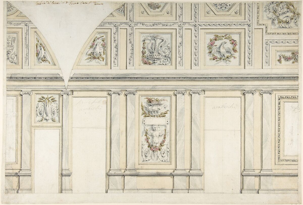 - Medium: Pen and black ink, brush with gray, yellow, green and pink watercolor, over black chalk or leadpoint; ruler and compass constructed