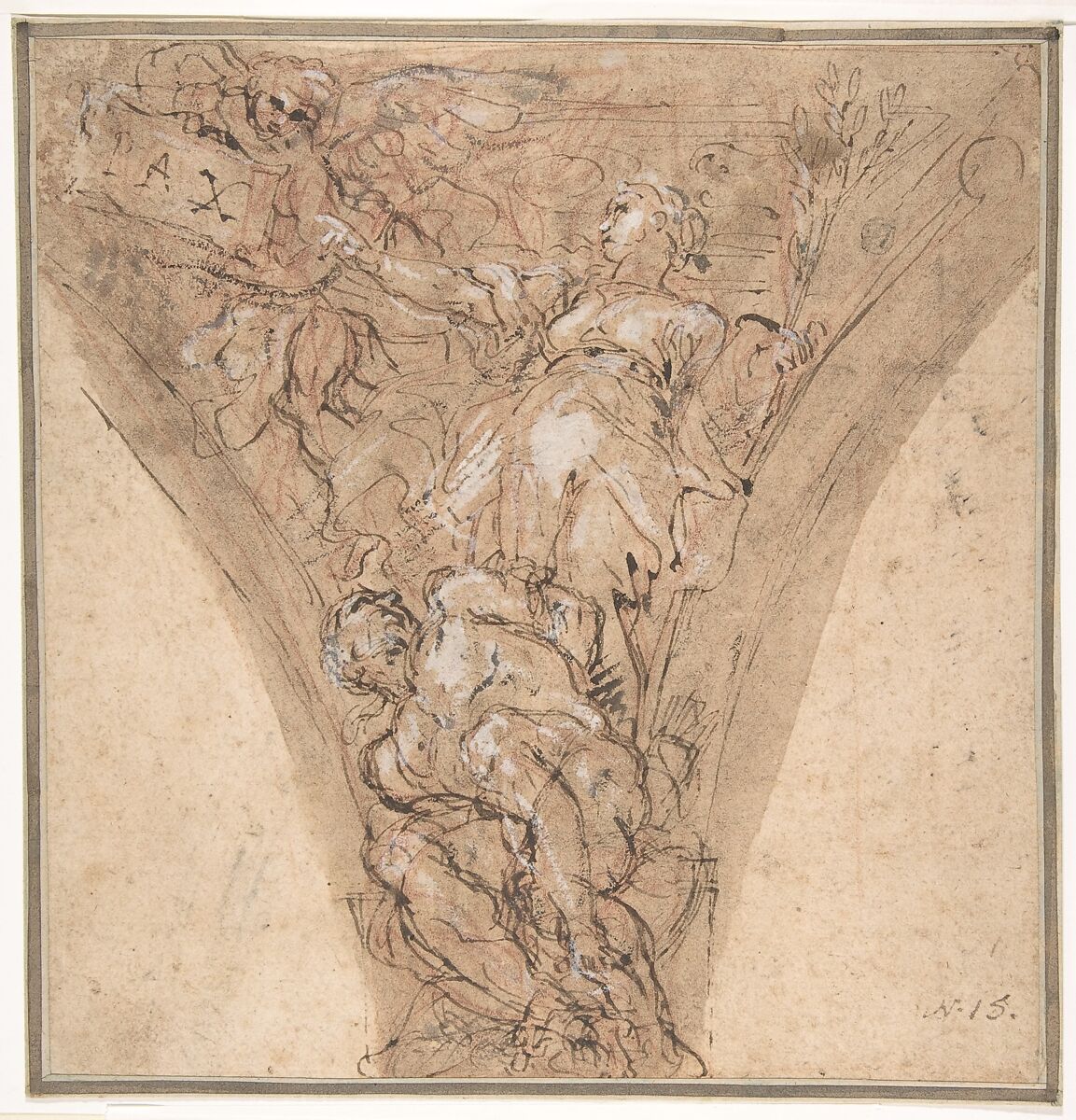 This drawing intended for a spandrel, one of the many unexecuted compositions, shows Peace holding an olive branch, pointing to an angel with a plaque inscribed "PAX," and triumphing over the bound Fury of Hell below. Consistent with the description of this figure provided by Maratti's biographer, Giovanni Pietro Bellori, who devised the content of the painted decoration, Peace holds an olive branch and tramples underfoot a shackled Fury symbolizing War, whose bellicosity is vanquished: "Siegue la Pace apportato al mondo con l'umanità di Cristo, a' cui piedi gilace it Future d'Averno incatenato; tiene ella in una mano il ramo dell'olivo e con l'altra addita un angiolo che spiega it motto: ET IN TERRA PAX" (from Bellori's Life of Carlo Maratti).