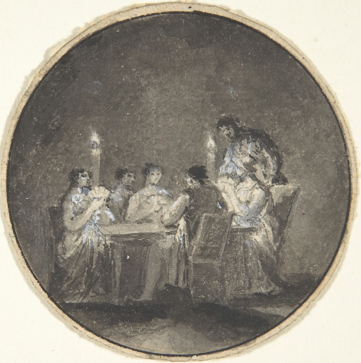 This circular images of men and women playing cards by candlelight may be a design for a book illustration.