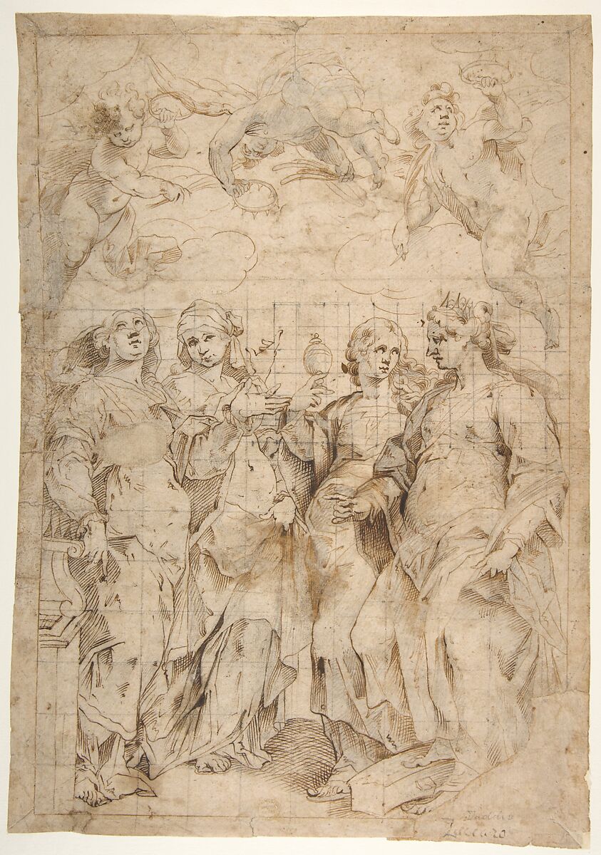 - Title: Saint Cecilia, Saint Mary Magdalen, Saint Catherine of Alexandria, and Saint Agnes, Angels with Palm Branches and Crowns Above (recto); Sketches of Three Standing Figures and Arithmetic Calculations (verso)