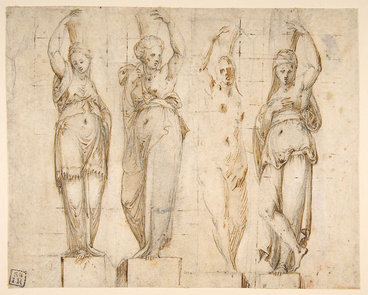 - Medium: Pen and brown ink, over black chalk; squared in pen and brown ink