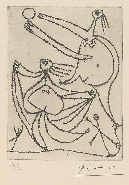 In the early winter of 1932, Picasso made about twenty etchings of women at the beach, similar to a series of paintings he had made the previous summer. Although small in size, the prints possess a vitality that transcends the sheet. Picasso pulled his own proofs and enjoyed experimenting with different effects. He achieved the pebbly line of these frolicking bathers by leaving large bubbles in the acide used to etch the plate.