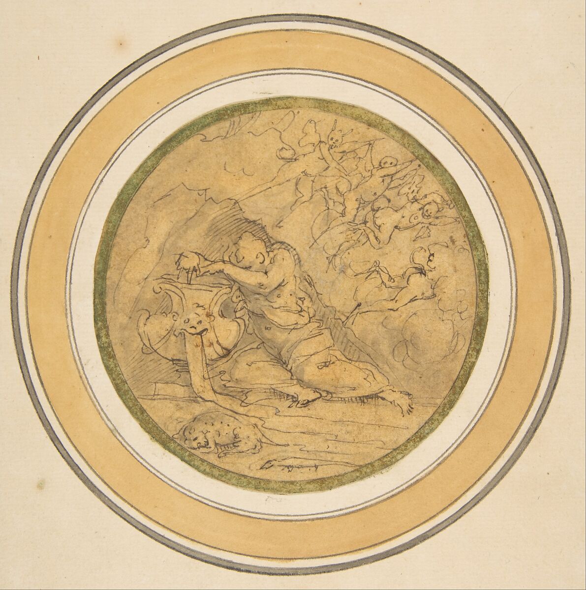 The two rapid sketches with the Allegory of Forgetfulness (acc. no. 67.95.3) and the Allegory of Sleep (acc. no. 67.95.4) were executed in pen and brown ink by the Renaissance artist and historian Giorgio Vasari in a quick and spontaneous manner to record his ideas for a ceiling or wall decoration. In 1981 Julian Kliemann pointed out that Vasari’s allegorical drawings in the Metropolitan Museum of Art correspond with two sections of a ceiling decoration of a bedroom (possibly for Francesco I de' Medici) planned by Vincenzo Borghini in a text datable ca. 1569-70. The Allegory of Forgetfulness is represented as a river god resting on an urn from which flow the dark waters of Lethe. The sleeping leopard and lizard in the foreground play emblematic roles, while "certi spiritelli come diavolini," representing cares, fly away at upper right. The Allegory of Sleep (acc. no. 67.95.4) differs in a number of ways from Vincenzo Borghini's description for the bedroom project. The essential elements of Borghini's scheme are nonetheless present: Sleep is attended by a young woman, and butterfly-winged putti holding mirrors appear above.