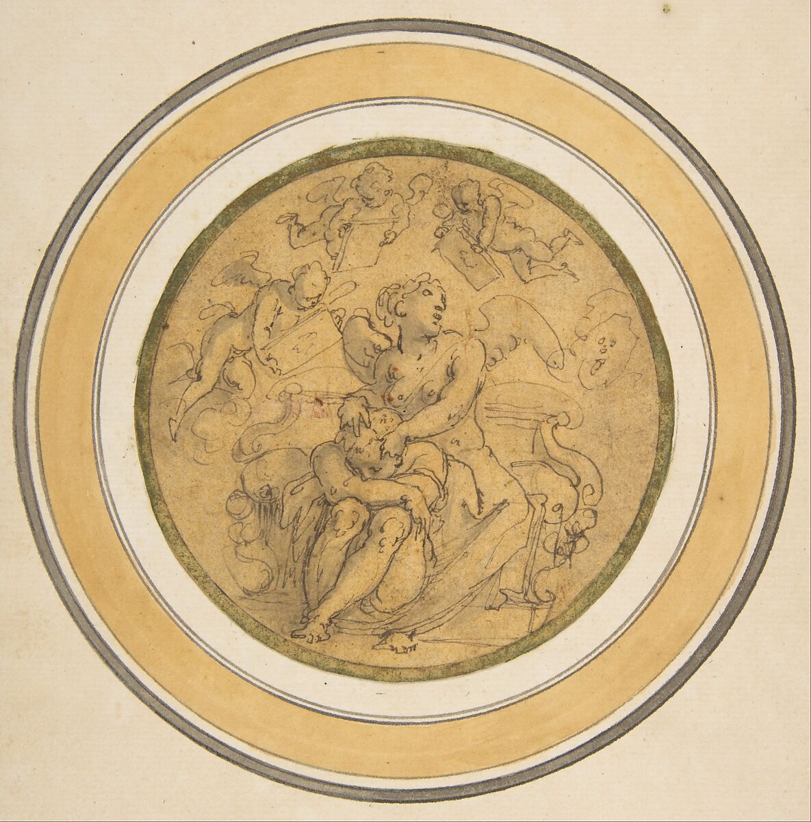 The two rapid sketches with the Allegory of Forgetfulness (acc. no. 67.95.3) and the Allegory of Sleep (acc. no. 67.95.4) were executed in pen and brown ink by the Renaissance artist and historian Giorgio Vasari in a quick and spontaneous manner to record his ideas for a ceiling or wall decoration. In 1981 Julian Kliemann pointed out that Vasari’s allegorical drawings in the Metropolitan Museum of Art correspond with two sections of a ceiling decoration of a bedroom (possibly for Francesco I de' Medici) planned by Vincenzo Borghini in a text datable ca. 1569-70. The Allegory of Forgetfulness is represented as a river god resting on an urn from which flow the dark waters of Lethe. The sleeping leopard and lizard in the foreground play emblematic roles, while "certi spiritelli come diavolini," representing cares, fly away at upper right. The Allegory of Sleep (acc. no. 67.95.4) differs in a number of ways from Vincenzo Borghini's description for the bedroom project. The essential elements of Borghini's scheme are nonetheless present: Sleep is attended by a young woman, and butterfly-winged putti holding mirrors appear above.